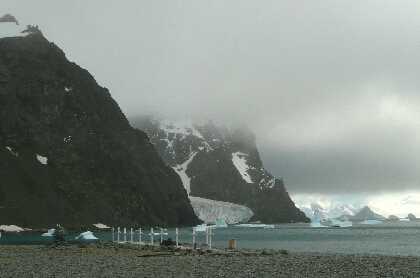 | Point Wild. Twenty two of Shackleton's men spent four months living in an upturned boat on the small spit (in the centre of the photograph), while Shackleton and five others sailed from here in the James Caird to seek rescue. Point Wild consists of a low gravel and boulder spit 20m long and 6m wide, now occupied by a chinstrap penguin colony. The nearby glacier has receded about 200m since 1916.