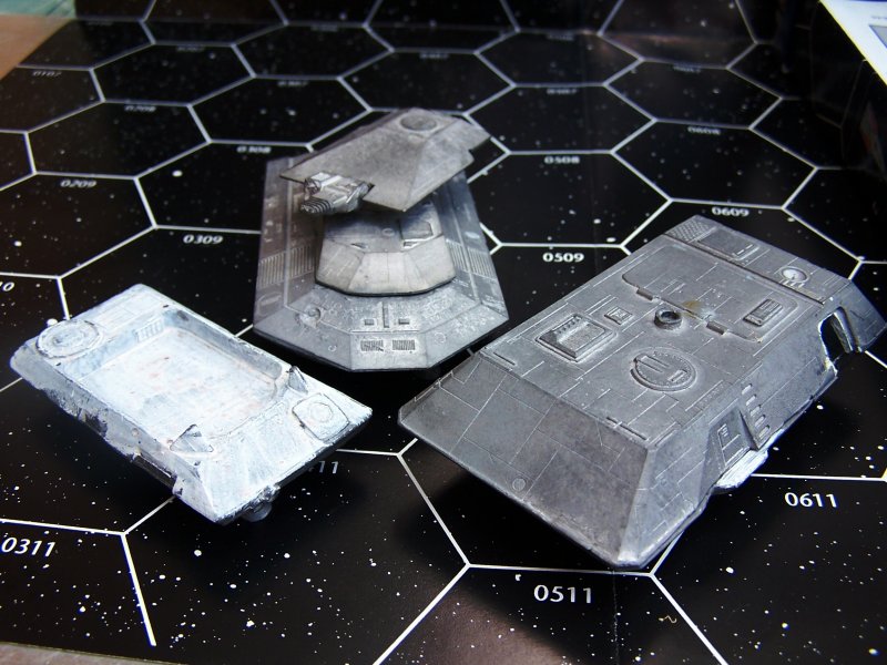 My collection of miniatures starships and vehicles. That's a Brilliant Lances map in the background, to give you some idea of scale. |